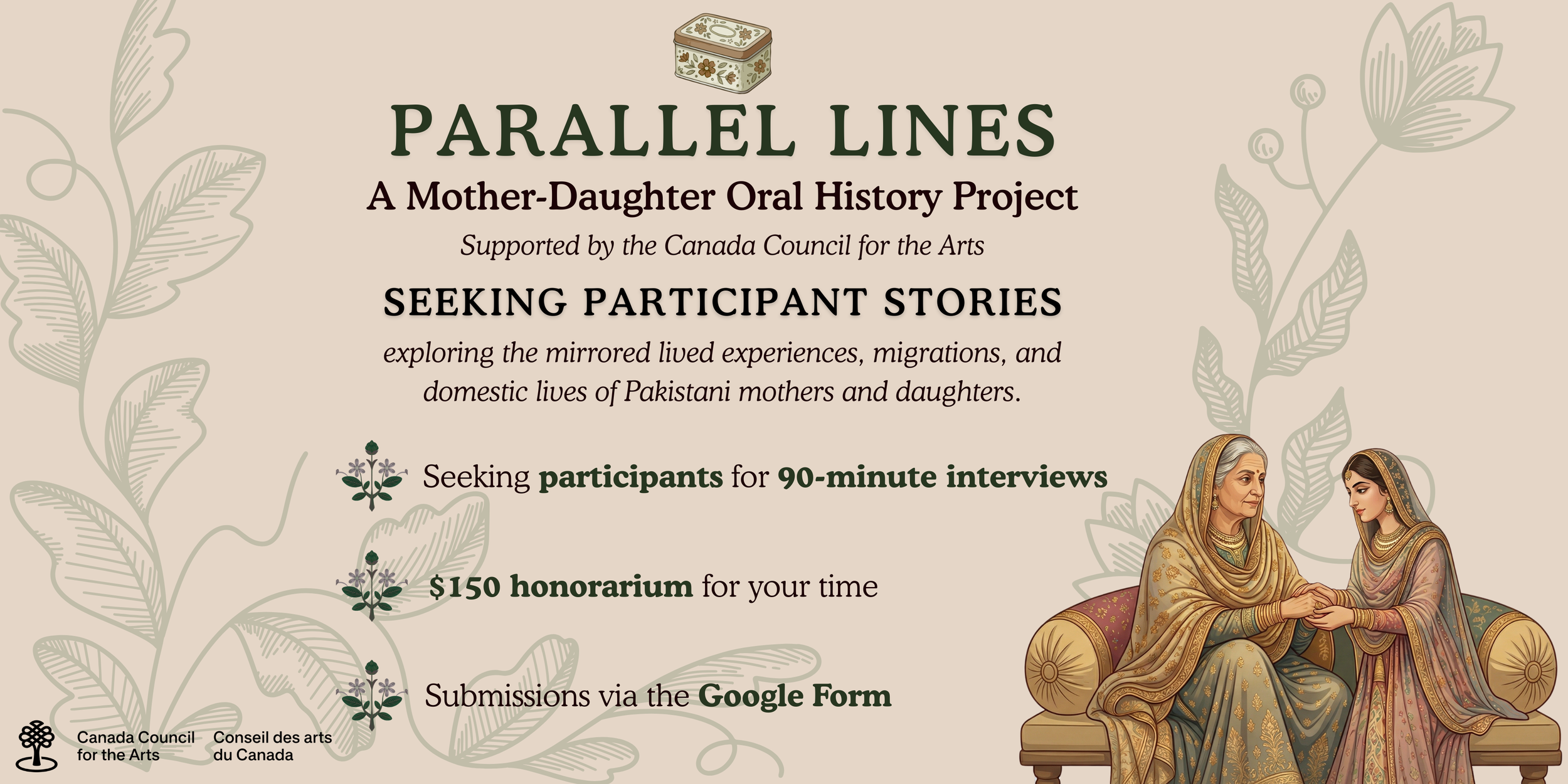 Currently in development with the support of the Canada Council for the Arts, Parallel Lines is an oral history initiative documenting the mirrored lives, migrations, and domesticities of Pakistani mothers and daughters. This project aims to archive the quiet, often overlooked intergenerational narratives that define the diaspora experience.